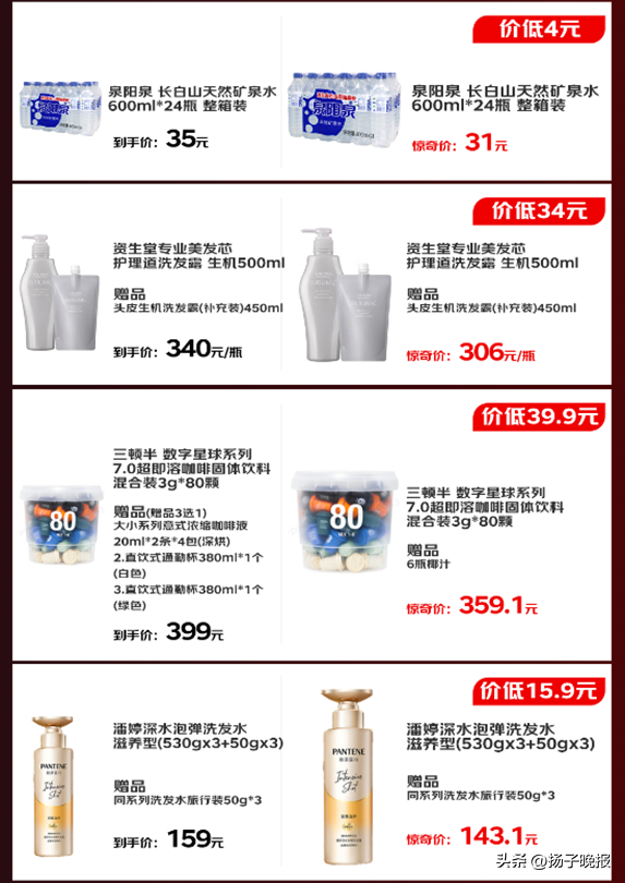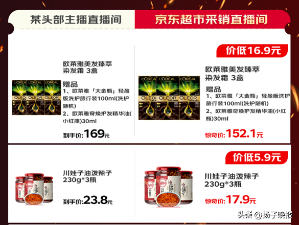 不仅如此,当晚直播间里的洗护、母婴、食品等各个品类的十多款产品,京东超市采销直播间价格优势都十分明显,相较李姓口红一哥直播间至少便宜10%。