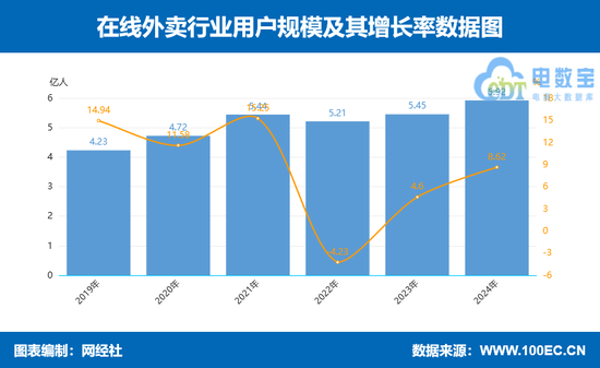 此外,据网经社报告数据显示,2024年我国在线外卖用户规模为5.92亿人,同比增长8.62%。而2020年至2023年市场规模与增速为:4.72亿人(11.58%)、5.44亿人(15.25%)、5.21亿人(-4.23%)、5.45亿人(4.6%)。