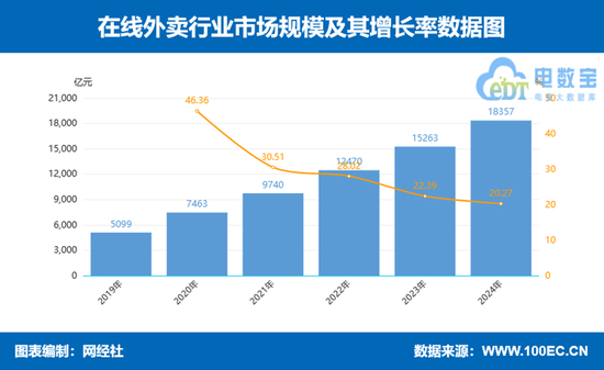据网经社《报告》显示,2024年,在线外卖市场规模为18357亿元,同比增长20.27%。2020年至2023年市场规模与增速为:7463亿元(30.51%)9740亿元(30.51%)、12470亿元( 28.02% )、15263亿元(22.39%)。