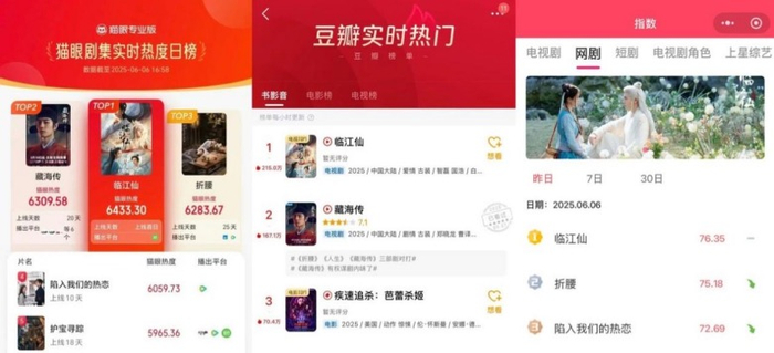 近日,由爱奇艺出品、欢娱影视联合出品的恨爱反转仙侠剧《临江仙》震撼上线,首播即燃爆全网。该剧上线便创下2.5小时爱奇艺站内热度破6000、24小时破9000的亮眼成绩,刷新2025年开播首日爱奇艺热度最高纪录;开播首日云合数据市占率达 12%,并持续上升至第二,强势登顶猫眼剧集实时热度日榜、豆瓣书影音实时热门榜、Vlinkage网剧榜等多平台榜首,相关话题持续霸屏热搜。这是继《延禧攻略》《墨雨云间》后欢娱影视再次制作贡献出的现象级影视爆款作品。