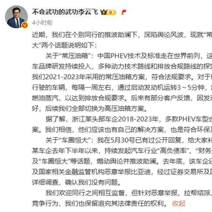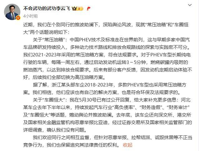 比亚迪品牌及公关处总经理李云飞今日微博发文称,近期,我们在个别同行的推波助澜下,深陷舆论风波,现就“常压油箱”和“车圈恒大”两个话题说明如下: