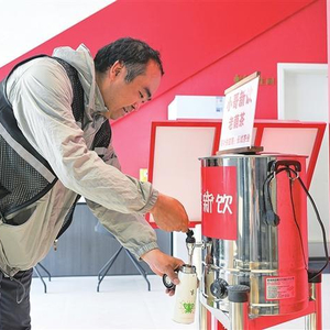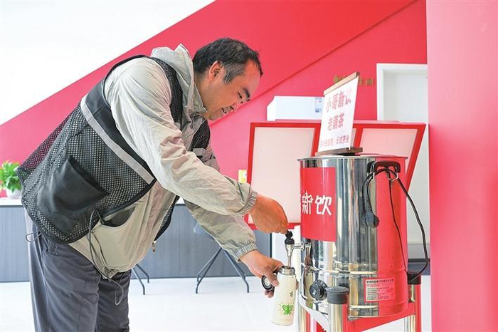 今年以来,重庆市江北区委社会工作部联合多个部门,巧妙利用闲置空间,打造新就业群体党群服务中心,为网约配送员、网约车司机、货车司机、快递员、网络主播等新就业群体提供休憩、心理咨询、法律援助等服务。图为一名快递员在重庆市江北区新就业群体党群服务中心领取免费茶水。新华社记者 王全超 摄