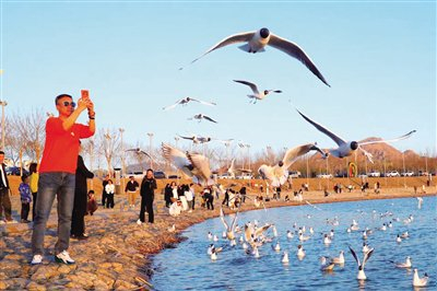 乌海湖让乌海市未来发展有了依托,也深刻改变着乌海市当地的环境气候。如今,乌海湖独有的湿地、沙漠等复杂多样的自然环境,成为水鸟栖息繁衍的天堂。据乌海文旅集团工作人员介绍,乌海湖南面、西面生长着大片芦苇和香蒲,为赤麻鸭、大天鹅、黑翅长脚鹬、鸿雁等雁鸭类、鹭类、鹤类等游禽和涉禽的繁衍创造了优越条件。这里还分布着许多喜欢湿润环境的雀形目鸟类,如黄头鹡鸰、灰鹡鸰、苇鹀等,这些水鸟在当地有的是繁殖鸟,有的是迁徙途经此地,种类繁多,尤其是在迁徙季节,数量可达几万只。每到春天,大批水鸟或翔集水面,或闲庭信步,或引吭高歌,或展翅翱翔,形成一个水鸟王国。