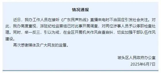 广东省湛江市坡头区人民政府办公室6月7日发布情况通报: