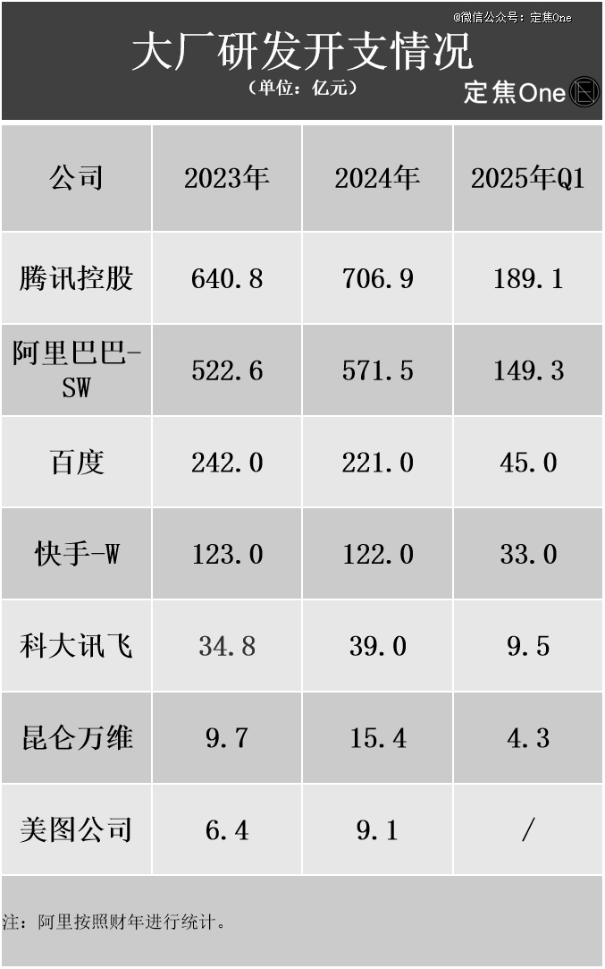 2023年以来,多家大厂的研发费用呈增长趋势,AI成为主要投入方向之一。腾讯、阿里、百度、快手的年度研发投入均维持在百亿级以上,其中腾讯在2024年投入超过700亿元,阿里也接近600亿元。即便是体量较小的昆仑万维、美图、科大讯飞,研发费用也在近两年明显上升。