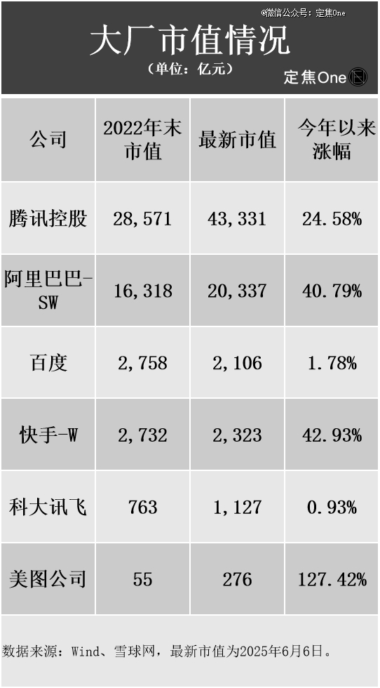 尤其是美图,今年以来的涨幅达到了127.42%,其次是阿里和快手,涨幅均超过40%。即便是体量较大的腾讯,涨幅也达到24.58%。