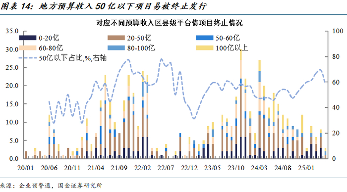 分区县资质来看,弱资质区县注册规模明显下降。预算收入在50亿以下的区县级平台债券注册规模为228亿元,前值为928亿元,三个月移动平均比重下降至35.4%。