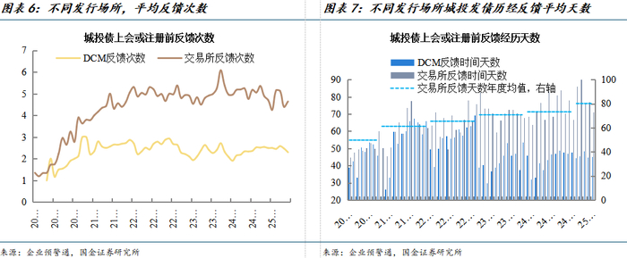 5月,城投债券的DCM审批节奏略微放缓,交易所审批节奏有所提速。分发行场所来看:本月DCM注册有效样本券146只,较上月有明显下降,而交易所样本券75只,同样较上月有明显下降。总体来看,DCM平均反馈次数为2.3次,前值为2.5次,交易所反馈为4.6次,前值为4.4次;从不同发行场所的城投债平均反馈天数来看,DCM反馈时间上涨至45.0天,前值为44.8天,节奏略微放缓;交易所反馈时间下降至71.2天,前值为77.0天,节奏明显提速。