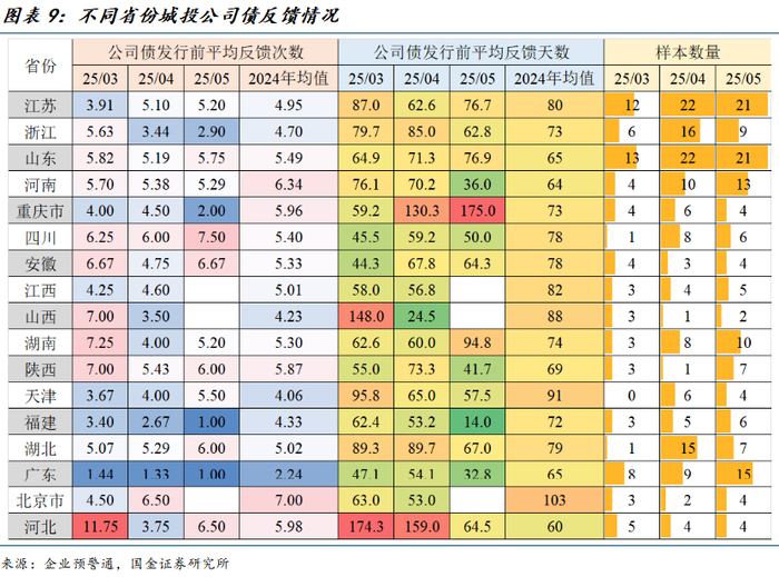5月,城投债券的DCM审批节奏略微放缓,交易所审批节奏有所提速。1)分发行方式与层级来看,私募城投公司债在地级市和区县级均呈现反馈时间缩短的特征。2)分省份来看,河南、福建、河北等地的审批节奏明显加快。3)分区县资质看,弱资质区县平台债券的审批节奏有所提速。