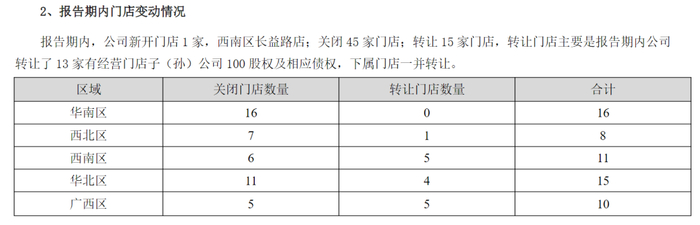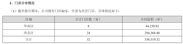 截至2024年12月31日,公司业务覆盖华南、西北区域,拥有门店32家。报告期内,公司关闭门店45家,转让门店15家,新开门店1家。