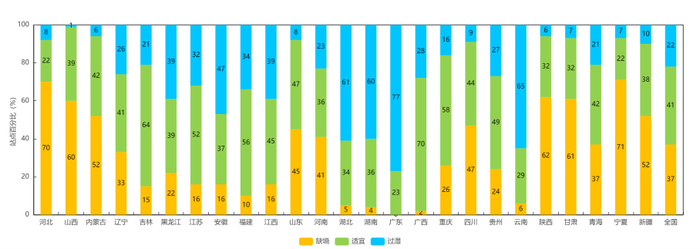 附图2 6月8日分省20厘米土壤墒情统计(站点百分比)