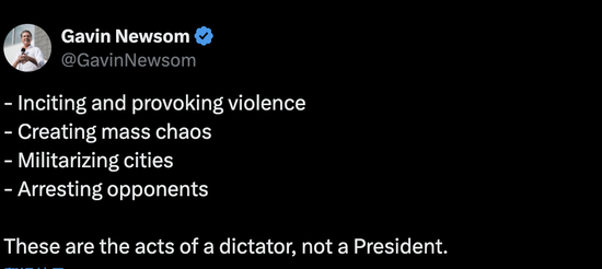 视频中,特朗普表示,若有官员“阻碍法律与秩序的执行”,将面临指控。纽森在配文中列出四项“独裁者行径”:“煽动和挑起暴力”“制造大规模混乱”“将城市军事化”“逮捕反对者”。他写道:“这些是独裁者的行径,不是总统应为之事。”