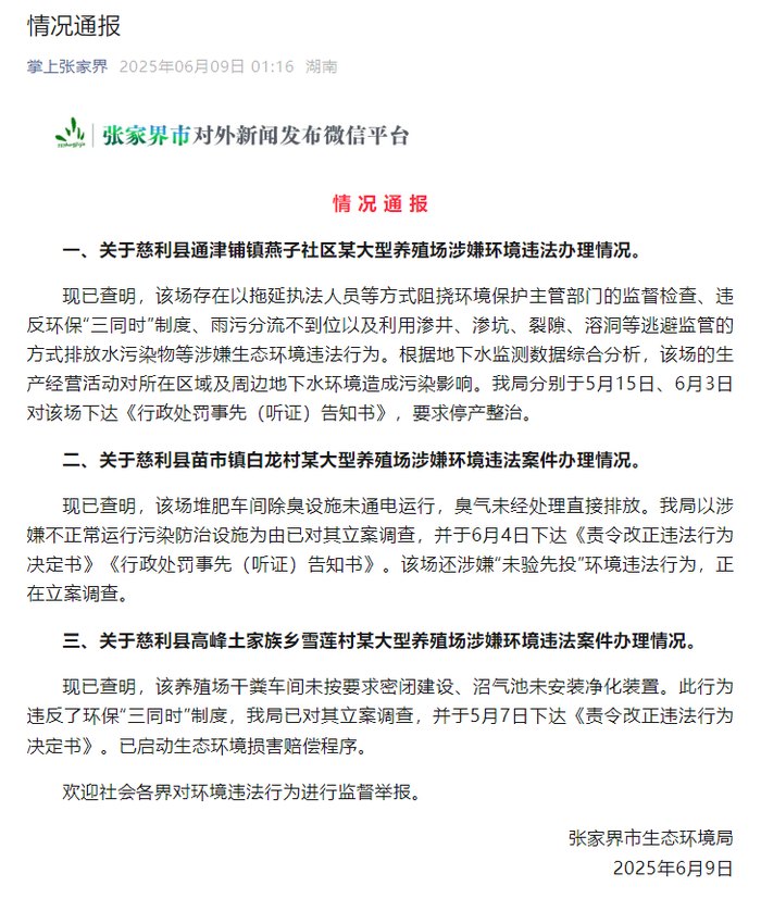 6月9日凌晨,湖南张家界市生态环境局通报慈利县三个大型养殖场涉嫌环境违法情况。全文如下: