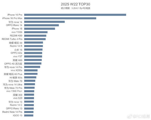 【CNMO科技消息】2025年第22周(5月26日-6月1日)国内手机销量数据揭晓。据CNMO了解,iPhone 16 Pro与iPhone 16 Pro Max表现强劲,包揽销量冠亚军,成为第22周消费者购机热门之选 。这两款机型凭借苹果生态、性能及影像,吸引多数用户购买,体现出苹果在高端手机领域的地位。