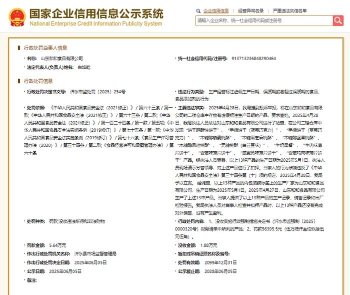 山东和和食品公司因篡改食品生产日期被依法处以罚款5.64万元