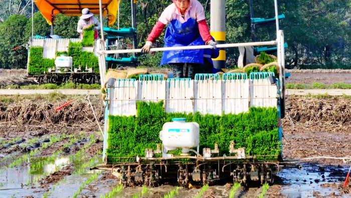 在江苏省常州市天宁区青龙街道武城村的稻田里,3台插秧机来回穿梭在田间,碾过泛起涟漪的水田,将一株株嫩绿的秧苗精准植入大地,种下丰收的希望。