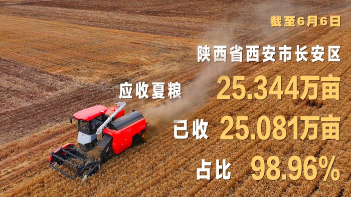 今年夏收开展以来,西安市长安区成立3个应急作业队伍,设置8个跨区作业接待站,提供油料、维修等一站式服务,组建5个技术组,实地研判小麦收获时间,开展技术指导工作。截至6月6日,长安区应收夏粮25.344万亩,已收25.081万亩,占比98.96%。