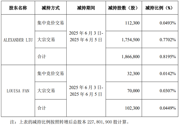 ALEXANDER LIU和LOUISA FAN于2025年6月3日至5日期间,分别减持1,866,800股和102,300股,合计减持1,969,100股。以上述三个交易日区间股价31.56元计算,二人减持套现约6214.48万元。