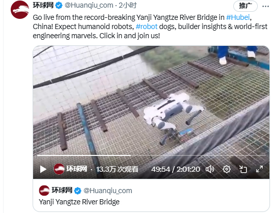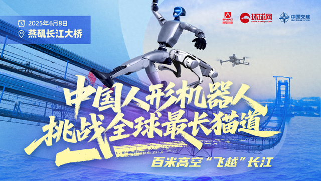 2025年6月8日下午,全球网友通过环球网在国内外的直播间,目睹了湖北燕矶长江大桥世界最长猫道上的精彩一幕:中国人形机器人在横跨长江的猫道上冒着风雨阔步前行,中国机器狗跨越障碍稳健迈步,它们与这座超级工程遥相呼应,一同见证了中国科技与大国基建的实力双秀。