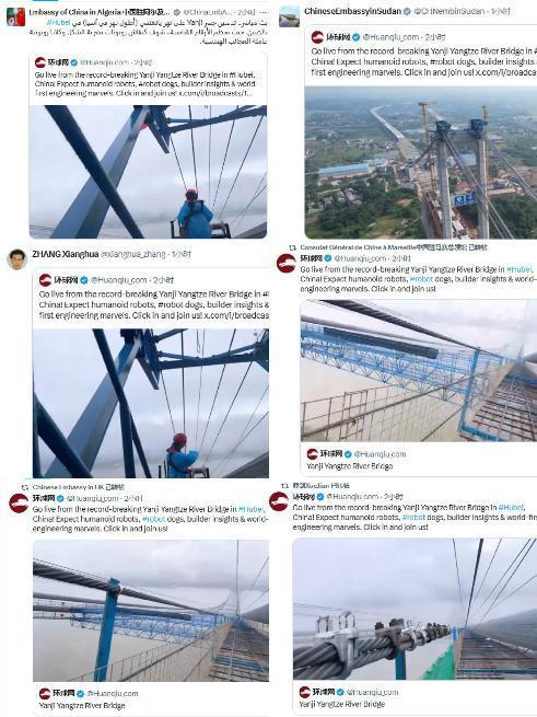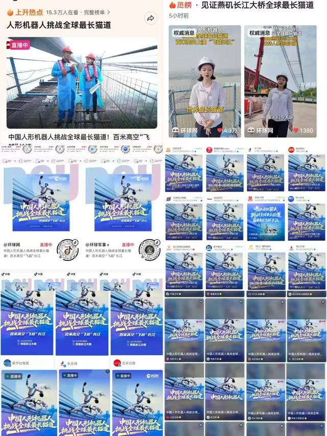 截至6月9日 10:00时,该直播短视频+直播在国内观看量超过3000万,其中实时直播全平台在线人数100万+。#见证燕矶长江大桥全球最长猫道、#人形机器人玩梗蒜鸟蒜鸟、#人形机器人挑战全球最长猫道、#人形机器人的底层逻辑与世界格局 等5个话题冲上抖音、快手热搜。直播还被新华社电视、新华社快看、北京日报、东方网、重庆卫视、看看新闻、武汉发布、长江新闻号、湖北文旅、国资小新、爱奇艺等91家各级媒体账号和央企平台转播,这些平台总粉丝超5亿。