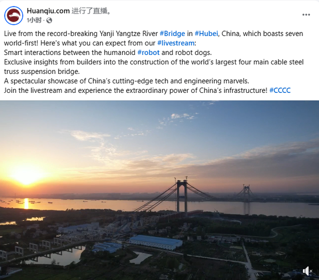 这场《中国人形机器人挑战全球最长猫道!百米高空“飞越”长江》为主题的超级工程全球直播,由环球网策划发起,与中国交建、中交二航局紧密联动,创新的实现了中国最先进机器人技术和“基建狂魔”的跨界联动,首次创新地发起了中国人形机器人猫道挑战赛。直播中,环球网主持人在猫道上完成"高空寻宝""云端'缆'运"等系列挑战,并与国产机器人、机器狗展开趣味互动,中交集团的专家们现场科普世界最大跨径四主缆悬索桥的建设创意和科技创新,揭秘背后蕴藏的大国基建智慧,深度呈现“中国桥”建造传奇。