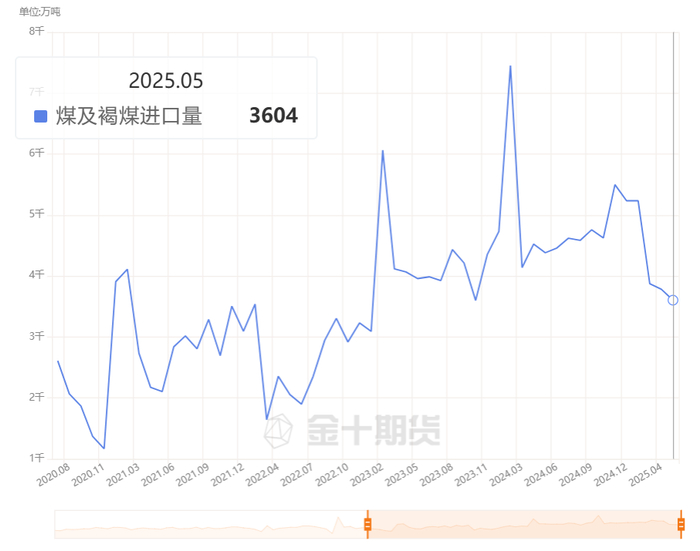 大宗商品分析师Colleen Howe表示,海关总署数据显示,中国5月煤炭进口量为3604万吨,较2024年5月的4382万吨减少18%,为连续第三个月同比减少,此前自2022年11月起(除受春节影响的1-2月外)每月均保持同比增长。2025年1-5月,中国煤炭进口总量为1.88亿吨,较去年同期的2.049亿吨减少8%。