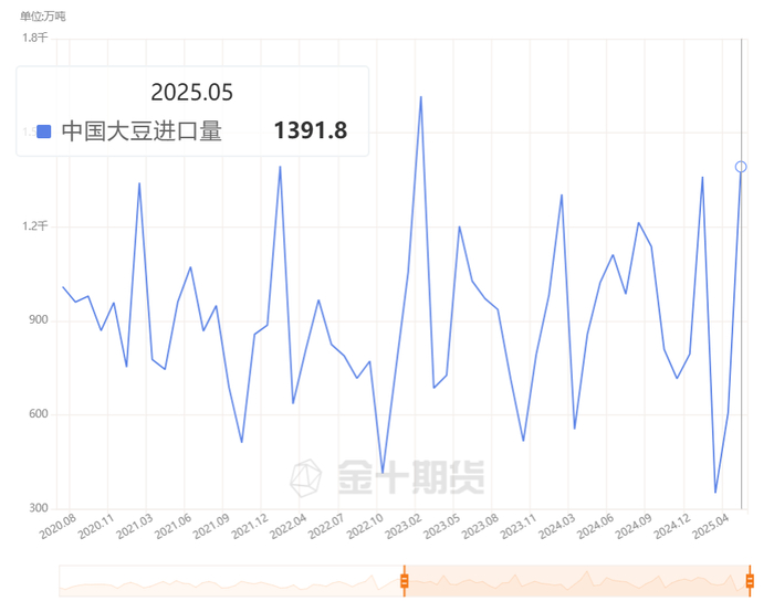大宗商品分析师Ella Cao和Lewis Jackson最新报告称,海关总署数据显示,中国5月大豆进口创下1392万吨的历史新高,较4月的608万吨增长逾一倍,同比去年5月增加36.2%。2025年1-5月,中国大豆累计进口3711万吨,同比微降0.7%。4月进口因巴西发货延迟及长期通关延误降至10年低点。分析师Rosa Wang表示,目前通关时间已从20-25天恢复至两周左右,压榨厂开工率已回升至50%以上,豆粕提货情况良好,导致大豆5月进口量超出1200-1250万吨的预期。