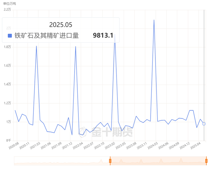 据大宗商品分析师Amy Lv和Lewis Jackson的最新分析,海关总署数据显示,中国5月铁矿石进口量为9813万吨,环比4月的1.0314亿吨下降4.9%,也低于去年同期的1.0203亿吨。