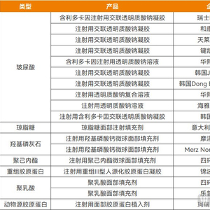 整体来看,截至目前国内已有110多款用于医美注射填充的产品获批(绝大多数为三类医疗器械,肉毒素为药品批文),主要材料包括玻尿酸、动物源胶原蛋白、重组胶原蛋白、肉毒素等7种,加上尚在冲刺首证的PDRN、ECM、壳聚糖等领域,医美材料日趋丰富,新老产品同台竞技,市场争夺大战一触即发。