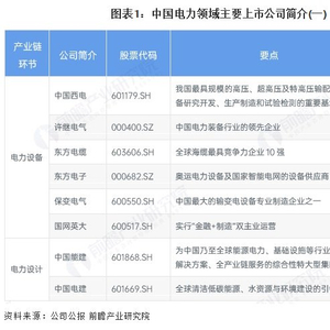 电力是国家重要的公共事业之一,目前产业内涉及的上市公司主要分布在上游电力设备和电力设计环节,与中游的发电环节。其中,涉及发电环节的代表性上市公司有华能国际、大唐发电、华电国际、国电电力、中国电力、浙能电力等。产业链上市企业汇总如下: