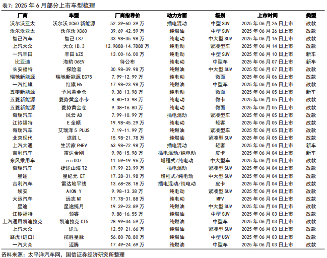 2025年6月部分车型披露上市,重点关注领克900、蔚来萤火虫等车型。
