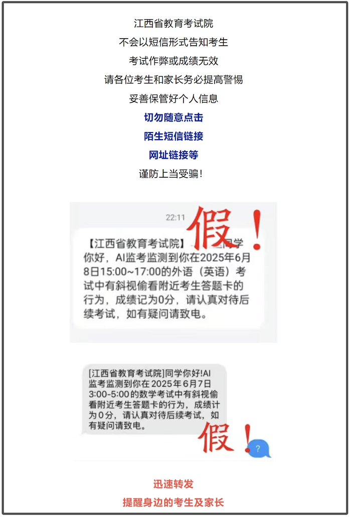 此前,教育部和各地考试院已多次预警,高考期间不法分子可能通过伪造短信、虚假链接等方式实施诈骗,例如谎称“作弊被抓”“提前查分”等,诱导考生点击钓鱼网站或支付“罚款”。