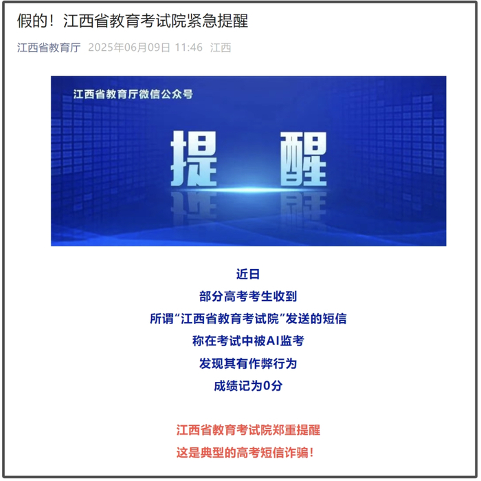 日前,部分高考考生收到所谓“教育考试院”的短信,称在考试中被AI监考发现其有作弊行为,成绩记为0分。
