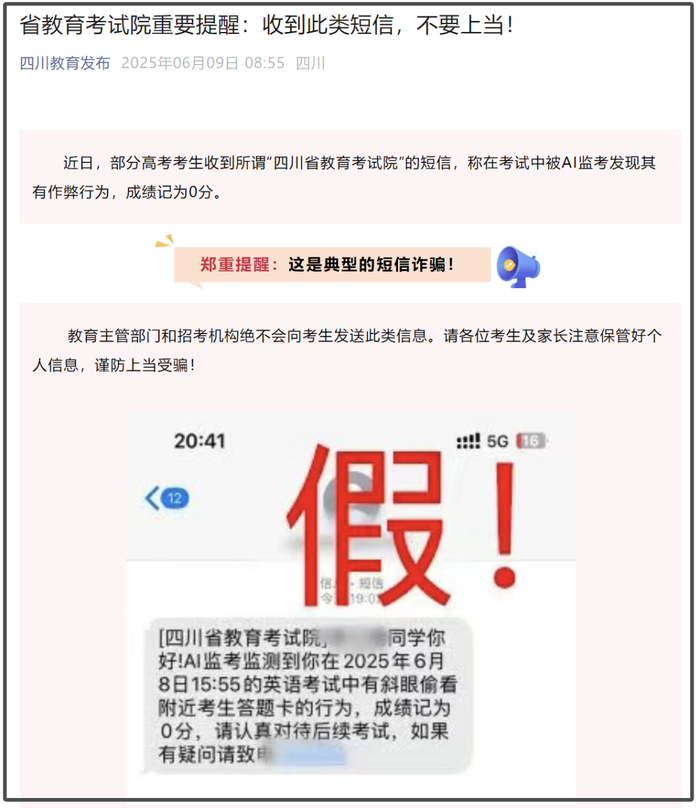 6月9日,四川省教育考试院提醒,这是典型的短信诈骗,教育主管部门和招考机构绝不会向考生发送此类信息,请各位考生及家长注意保管好个人信息,谨防上当受骗。