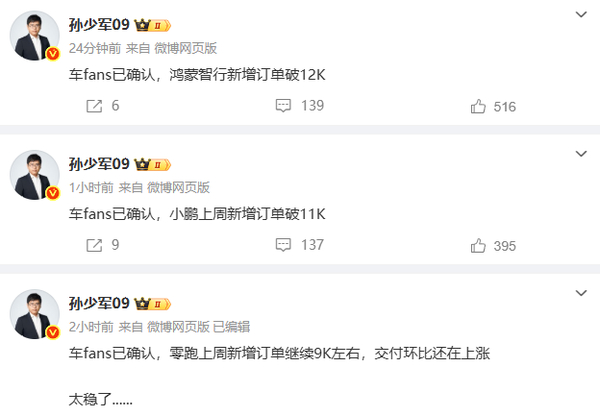 【CNMO科技消息】6月9日,车fans创始人孙少军透露了三大造车新势力企业的上周新增订单数据:鸿蒙智行(包含问界、智界、享界、尊界四大品牌)上周新增订单超1.2万份、小鹏汽车上周新增订单超1.1万份、零跑汽车上周新增订单约0.9万份。