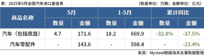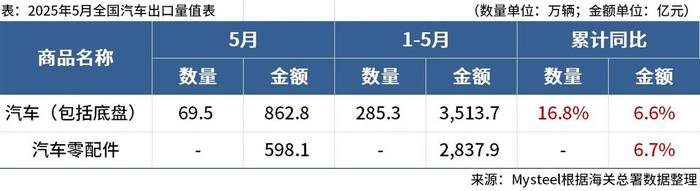 6月9日,海关总署最新数据显示,2025年5月中国出口汽车69.5万辆;1-5月累计出口285.3万辆,同比增长16.8%。2025年5月中国进口汽车4.7万辆,1-5月累计进口18.2万辆,同比下降32.8%。