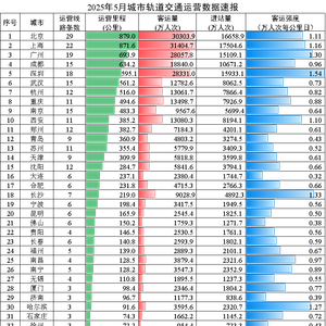 2025年5月,31个省(自治区、直辖市)和新疆生产建设兵团共有54个城市开通运营城市轨道交通线路326条,运营里程10978.3公里,实际开行列车368万列次,完成客运量28.7亿人次。