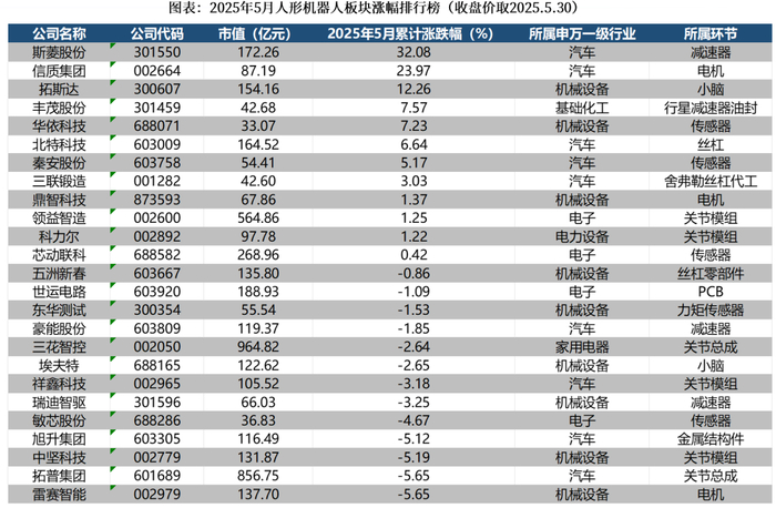 产业在新技术应用、场景落地、行业标准等多方面均取得重要进展。机器人指数(884218)4月8日至5月12日区间涨幅约30%,其后维持震荡调整态势,但是板块活跃度依旧不减。从中长期维度看,行业潜在市场成长空间较大,属于“长坡厚雪”的新质生产力赛道,需要坚持重点跟踪、长期配置策略。2025年5月,人形机器人领域迎来多项重要进展:1)特斯拉Optimus展示单一神经网络驱动下的复杂家务和工厂作业能力;2)Figure机器人实现宝马产线20小时连续轮班;3)北京创新中心发布全球首个《人形机器人智能化分级》标准;4)上海张江大会制定5项行业技术标准,推动产业规范化发展。这些进展标志着行业正加速从实验室走向商业化应用阶段。