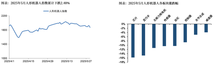 5月份,A股人形机器人板活跃度依旧不减,整体呈现出“先扬后抑”态势。自4月8日开始,伴随着特朗普关税政策影响趋缓,机器人行情再次启动、板块指数持续上涨至5月12日,区间涨幅达到为30%左右,其后维持震荡调整模式。从中长期维度来看,行业在“政策支持+技术突破+量产降本”等综合因素驱动下潜在成长空间较大,属于“长坡厚雪”的新质生产力赛道,需要坚持重点跟踪、长期配置策略。