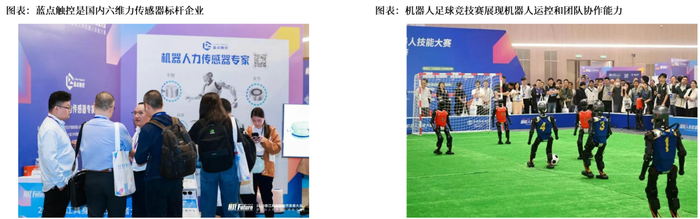 人形机器人核心部件技术创新赛聚焦传感器、一体化关节、控制器、电子皮肤等关键领域,展示核心部件的技术创新、产品创新和产业应用前景。1)一体化关节:黑戈尔电机展示了突破国外技术壁垒的IPM弱磁控制+线圈灌封技术,产品性能直接对标Maxon及Nidec;2)传感器:蓝点触控展示了100%国产化的六维力传感器,凭借高灵敏度和实时动态力学反馈能力,已成为国产六维力传感器领域的标杆企业;3)电子皮肤:开发的电子皮肤实现了80组1280个单元4种模态的多维感知,为人机安全共融提供了革新性解决方案;4)控制器:国讯芯微展示了基于自研硬实时操作系统的NSPIC系列控制系统,体现了源自中国航天及半导体领军企业的技术积累。