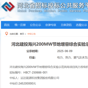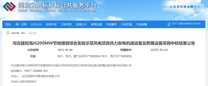 6月9日,河北省招标投标公共服务平台发布《河北建投海兴200MW节地增容综合实验示范风电项目风力发电机组设备及附属设备采购中标结果公告》。