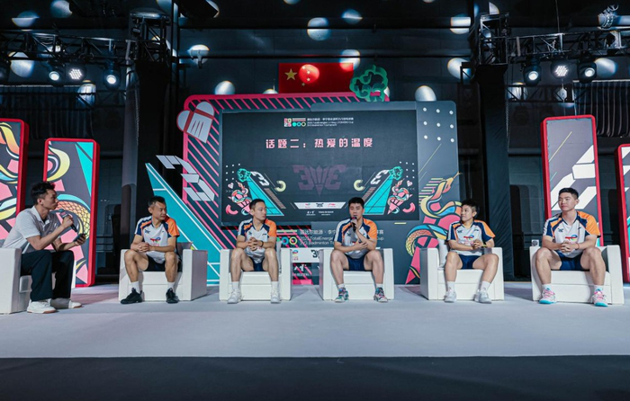在随后冠军们参与的环节,傅海峰、张楠、徐晨、周昊东、杜婧五位世界冠军共话赛事革新之路。五人对羽毛球运动以及3V3模式“降低门槛、强化协作”全民运动进行探讨分享,傅海峰总结道:“3V3作为全民可参与的体育赛事非常值得肯定,体育是提升人民健康生活水平和实现美好生活向往的重要途径”。他鼓励广大羽毛球爱好者坚守梦想、保持热爱,享受运动带来的收获与快乐。