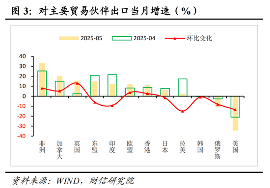 分国家和地区看,5月份我国对美国出口同比下降34.5%,降幅较上月扩大了13.5个百分点(见图3),贡献了出口增速回落幅度的近五成。尽管日内瓦经贸会谈后,中美间关税大幅下调,但美国对中国征收高关税的问题并未完全得到解决,依然是拉低我国出口增速的主要因素之一。5月份出口仍然保持了较高正增长,两年平均增速达到6.1%,较上月提高1.4个百分点,表明具有较强韧性,主要在于我国转口贸易增速较高与贸易伙伴持续扩容。其一,5月份我国对主要转口贸易伙伴:加拿大、东盟、香港等地出口维持高速增长,分别为20.3%、14.8%、11.4%(见图3);其二,我国增加了对非洲等一带一路国家以及英国等地的贸易往来,如对非洲、英国等贸易伙伴出口增速分别较上月上涨了8.0、13.1个百分点。