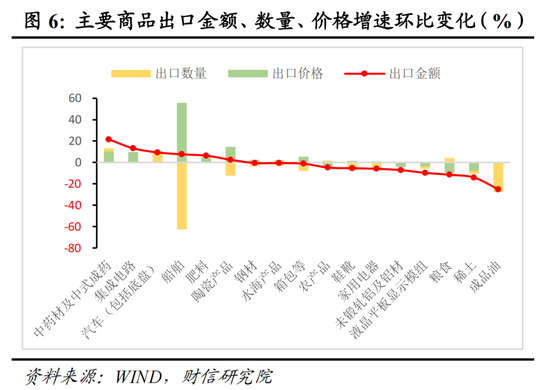 从出口数量和价格看,出口数量增速和价格增速环比回落的品种分别为11种和7种,且数量增速回落幅度更大一些(见图6),说明数量因素是出口同比回落的主要拖累。