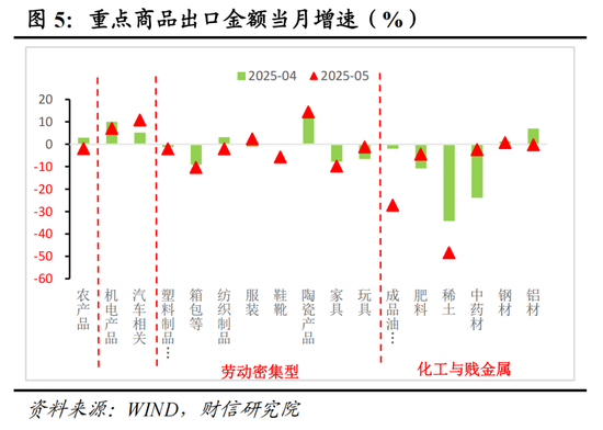 分产品看,5月份机电产品出口同比增长7.2%,较4月份回落2.9%(见图4),贡献了出口增速回落幅度的超五成。分重点商品看,除陶瓷产品以外的劳动密集型产品以及所有化工与贱金属产品出口增速均较上月下降,对本月出口增速形成拖累(见图5)。