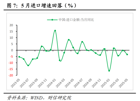 四:总结:5月份出口与进口增速均出现回落。出口增速回落主要源于关税冲击持续扰动,对美出口大幅下降,同时高基数产生下拉作用;但当月出口仍然保持较高正增长,主要在于我国转口贸易增速较高以及贸易伙伴持续扩容。进口增速回落,共呈现出两个特点:一是大豆、粮食、农产品等进口数量明显上升,或与对美“抢进口”加速有关;二是其他产品进口数量均出现明显回落,反映出国内需求恢复依然偏慢。往后看,虽然近期中美间关税大幅下调,且第二轮会谈正在持续推进,但本轮贸易战有三大核心关键并未改变,仍将对我国出口形成冲击,国际大宗商品价格下降也会对出口增速形成拖累;我国贸易伙伴多元化和贸易结构优化,能缓冲部分影响;预计本轮关税冲击将影响出口增速下降约7%,考虑1-5月出口累计增长6.0%,2025年全年出口增速约为0%。