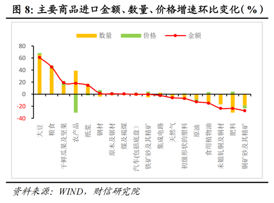 去年同期进口增速较前值大幅回落6.2个百分点(见图7),基数大幅走低,表明基数效应不能解释5月份进口增速的回落。从进口量和价看,12种商品进口数量增速回落,8种商品进口价格增速环比下降,说明数量因素是进口增速回落主因。分产品看,本月进口数据呈现以下特点:一是大豆、粮食、农产品等进口数量明显上升(见图8),这一现象或与5月12日中美发布日内瓦联合声明宣布双方取消高额的报复性关税后,国内对美“抢进口”加速有关。二是其他产品进口数量均出现明显回落(见图8),反映出国内需求恢复依然偏慢,预计随着国内政策聚焦于扩内需等重点领域集中发力,未来内需逐渐回暖有望对进口增速形成支撑。