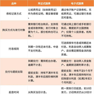 比如,凭证式国债以纸质凭证记录债权,需柜台购买且到期一次付息;电子式国债采用电子记账,支持线上购买且可定期付息,两者的发行对象和提前支取规则也存在差异(具体见下表)。