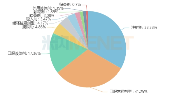 从剂型分布看,144个品种涉及10大剂型(以医保目录凡例的剂型分类计),注射剂“称王”,占比超过33%;以片剂、胶囊剂为代表的口服常释剂型紧接其后,占比超过31%;以口服溶液为代表的口服液体剂排位第三,占比超过17%。