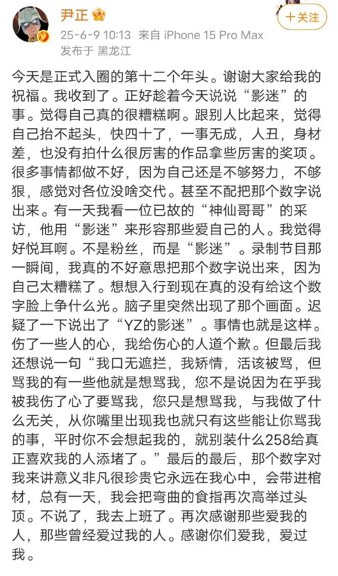 尹正在文中对粉丝道歉,并表示自己快四十岁仍觉“一事无成”,并列举了外貌焦虑、无重量级奖项等困扰,强调“影迷”一词源于对已故艺人张国荣的敬意,希望更突出对作品的支持。